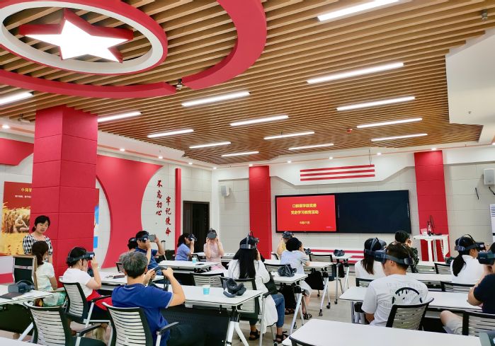 本次党史学习教育借助全新的头戴VR眼镜进行。带上VR眼镜后,通过不同的场景和时间线的切换,红军在漫天飞雪中艰难地爬雪山、在忍受饥饿伤病中互相搀扶着过草地的场景,可以生动的浮现在眼前;也可以“徜徉”在各大红色纪念馆中,感受着伟人先烈的光辉事迹;还可以近身“站在”嘉兴南湖的红船旁,“亲身体验”当年中共一大开会时的场景。