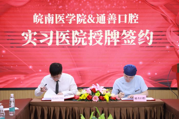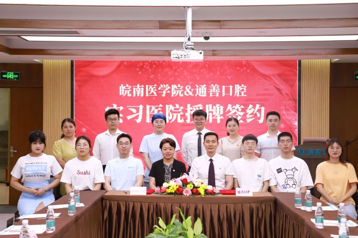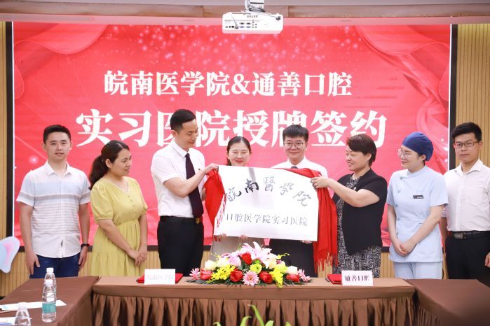 2021年6月18日,口腔医学院与无锡通善口腔医院举行实习医院授牌仪式,通善口腔党支部书记、通善口腔医疗连锁总院长房永兴,通善口腔医疗部部长张燕、人力资源部部长顾牧,口腔医学院党委书记、院长柴琳,副院长邓超,以及学院教师和毕业生实习生代表共10余人参加授牌仪式。