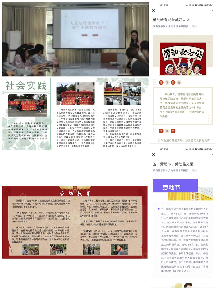 开展一次集中宣传活动。4月28日,人文与管理学院团委展开“三爱”学习主题教育活动,由学院团委副书记张露讲授,2020级全体团干参加。张露以闻一多的主要事迹开篇,其爱读书、爱国情感影响了在场的每一位学生。青春正当时,逐梦新征程,张露鼓励同学们积极学习优秀文化思想,全面提高自身素质,脚踏实地、勇担重任,努力成为新时代的先行者。同时,人文与管理学院学生会宣传部制作并张贴了“劳动教育”和“实践活动”两块展板,图文并茂地展现了人文与管理学院近期劳动教育的成果。4月29日至5月1日,人文与管理学院学生会微信公众号发布《劳动教育成就美好未来》、《五一劳动节,劳动最光荣》两篇推文,全面做好劳动教育宣传工作,营造良好舆论氛围。