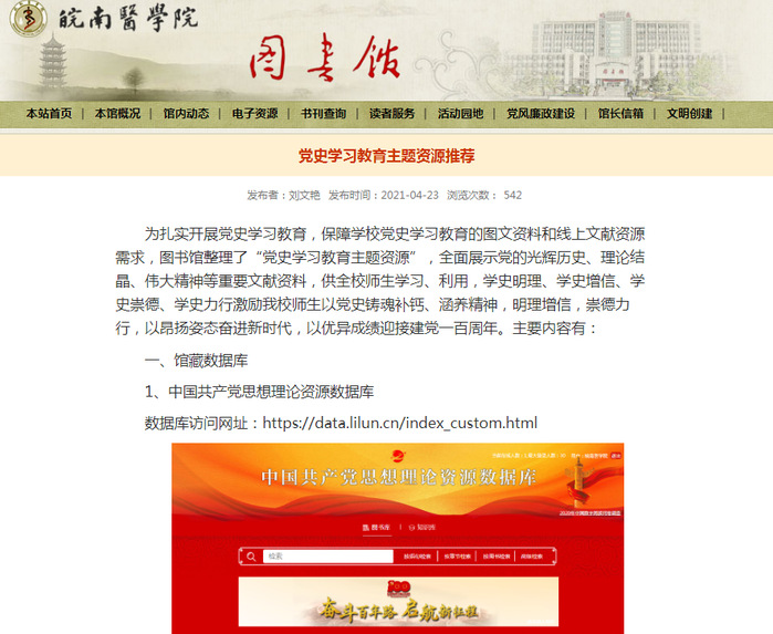 线上,图书馆在图书馆网站整理并发布了“党史学习教育主题资源”推荐,全面展示党的光辉历史、理论结晶、伟大精神等重要文献资料,供全校师生学习、利用;同时在图书馆微信公众号推出“建党百年”学习专栏,内容涵盖了党建专题、红色视频、党建图书、党刊精读等,满足师生读者利用电子终端设备随时随地进行党史学习的需求。