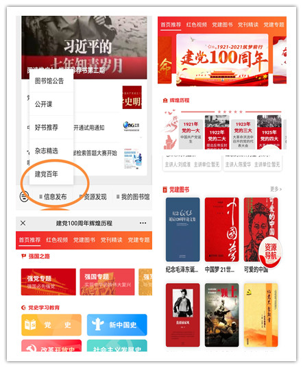 建党百年华诞切盼切望,党史学习教育如火如荼。作为学校的文献信息资源中心,图书馆充分发挥文献信息资源优势,多举措打造党史学习教育文献资源系列服务平台,通过纸质电子资源融汇、线上线下借阅交互,全方位、立体化推介推送党史党建文献信息,打造书香浓郁、随手可得的党史学习阵地,助力学校党史学习教育开展。