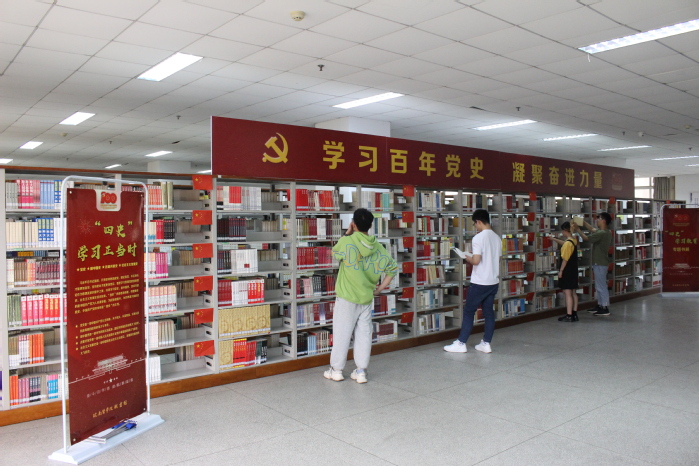 线下,图书馆党支部精心挑选出3000余册“四史”类图书,在第二借阅室打造以“学习百年党史 凝聚奋进力量”为主题的“四史”教育专题书展,激励全校师生学史明理、学史增信、学史崇德、学史力行。