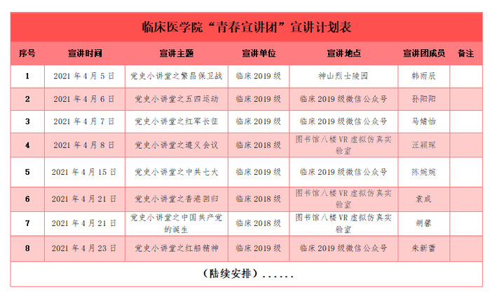 据悉,为教育引导青年团员“学党史、强信念、跟党走”,临床医学院团委还将通过主题党团日活动、“医心为你”健康科普、“百年征程铸辉煌,砥砺奋进新时代”庆祝建党100周年文艺活动等教育实践活动,引导青年学生立大志、明大德、成大才、担大任,努力成为堪当民族复兴重任的时代新人!