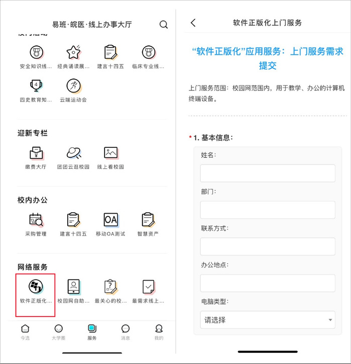校园网内用户可在正版软件服务平台(ms.wnmc.edu.cn)下载正版操作系统、Office办公软件和激活客户端,同时平台也提供了正版软件使用指南和操作视频,用户可自行学习使用。“苔花”党员志愿服务队负责解决各校园网用户在安装、激活过程中存在的技术问题,用户可在“今日校园”申请上门技术服务,通过打开“今日校园”APP,选择“服务”-“网络服务”-“软件正版化上门服务”进行预约信息填写。申请成功后,队员们会按照预约信息准时上门协助用户解决问题。