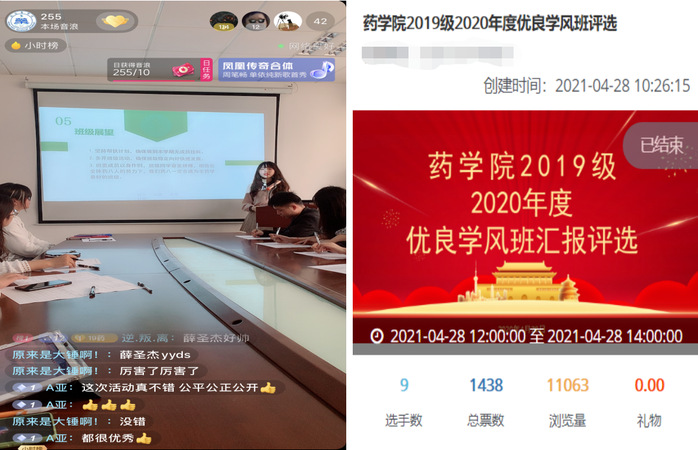 汇报活动开始前,2019级18个班级积极准备优良学风班评选材料,经初选后,有9个班级突出重围参加“优良学风班”现场汇报评选。本次活动采用线下汇报、线上直播的形式进行,汇报现场,各班选手从班级介绍、班级建设、班风建设、班级荣誉等方面,充分展示班级风采,现场赢得老师和同学们的阵阵掌声;线上直播,各班同学积极关注汇报情况,为班级同学加油助威,充分体现了班级荣誉感,线上投票为班级汇报助力加油。经过激烈角逐,根据现场评分、线上投票等情况,最终药学10班、药学5班、临药1班位列前三。