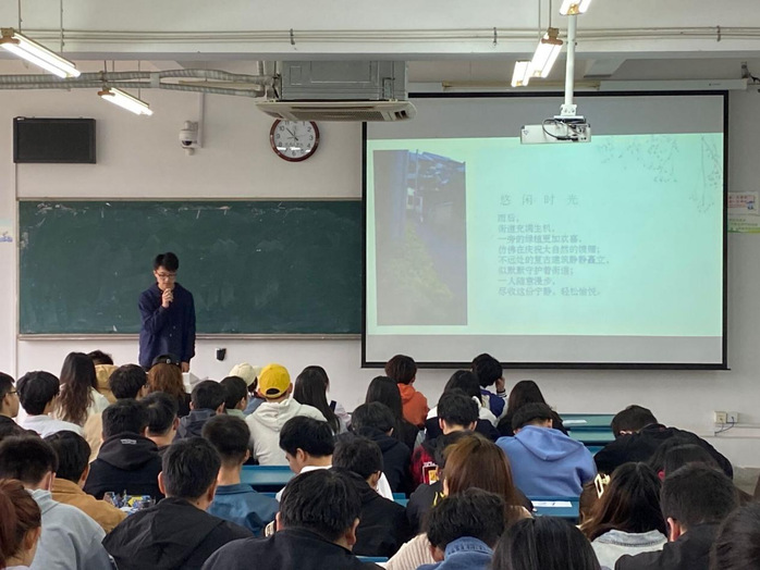 线下决赛于3月27日在1202教室正式开始,将通过评委打分、观众投票,并结合网络票选最终评选出获奖作品。上午9点,比赛正式开始。同学们依次上台以幻灯片与演讲结合的形式介绍自己的作品,讲述自己的生活。选手们紧扣大赛主题,展现出一张张精彩纷呈的作品,给予了观众及评委一场视觉盛宴。选手们绘声绘色的演讲、精致好看的幻灯片赢得场下观众如雷般的掌声,现场气氛到达高潮。
