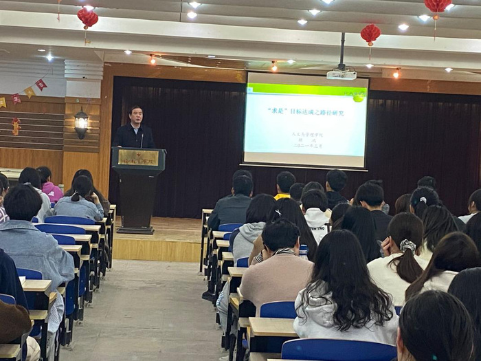 胡鸿以“‘求是’目标达成之路径研究”为题,从“求是”之缘、“求是”之源、“求是”之难以及“求是”之成四个方面进行具体阐释,围绕当代大学生要“做勇于担当民族复兴大任的时代新人”这个主题,阐明了做人做事的“是”的内涵、原则、方法,并详细分析了“求是”之难的主要成因,指出了达成“求是”目标的路径。胡鸿要求大学生要上下求索,努力承续历史精华与放眼国际潮流,做积淀深厚、视野广阔的时代新人;不断坚定理想信念与开拓创新思维,做追求高远、求真务实的时代新人;敢于思想解放与善于与人相处,做善于思考、从善如流的时代新人;富有人文关怀与敢于担当责任,做仁爱包容、深明大义的时代新人;熟读深悟专业名著与努力进行社会实践,做专业素养超群、追求卓越的时代新人;充满蓬勃朝气与沉稳踏实肯学,做激情四射、勤奋有为的时代新人。