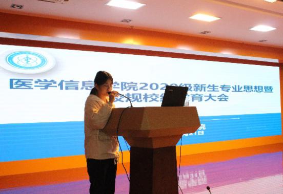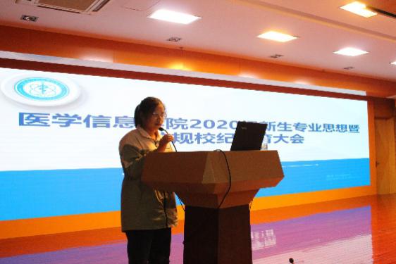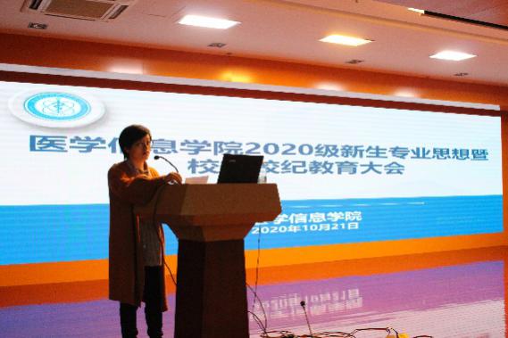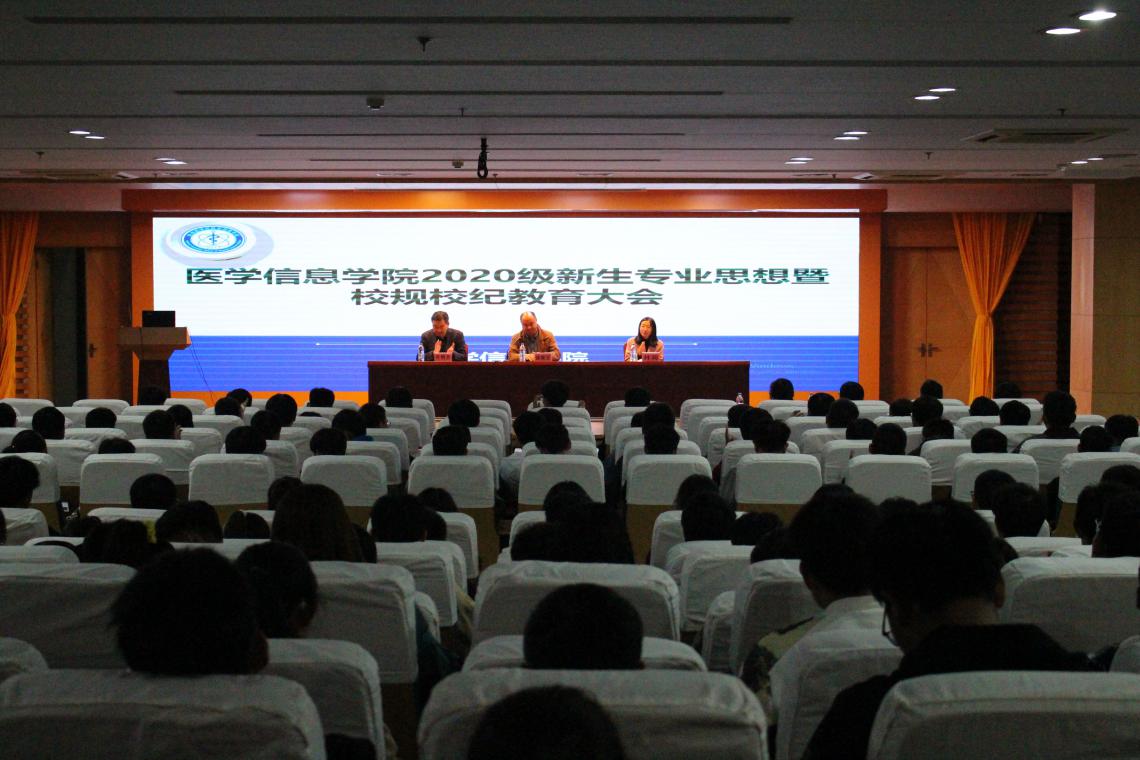 10月21晚,医学信息学院在图书馆三楼报告厅召开2020级新生专业思想暨校规校纪教育大会。医学信息学院党总支书记陈晓宏、副院长叶明全,新生辅导员林莉、邸柯柯,2020级兼职班主任及全体新生参加大会。会议由叶明全主持。