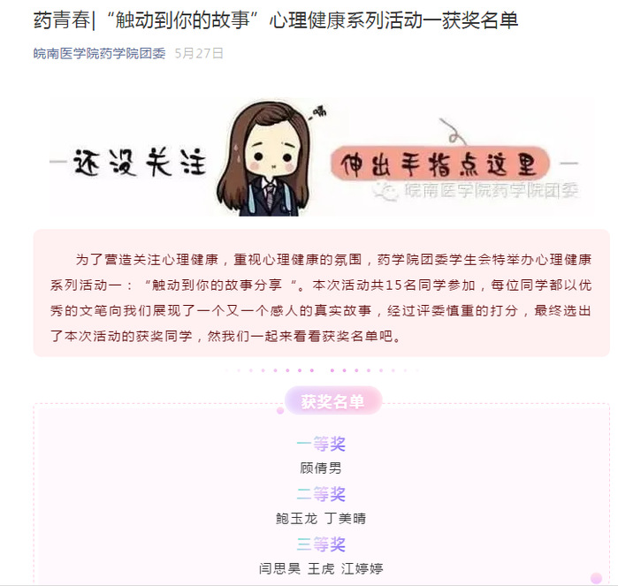 触动到你的故事。5月15日开始,为营造关注心理健康、重视心理健康的氛围,药学院团委学生会举办心理健康系列活动之“触动到你的故事”分享。同学们积极踊跃投稿,以优秀的文笔向大家展现了一个又一个感人的真实故事,丰富了同学们的生活。