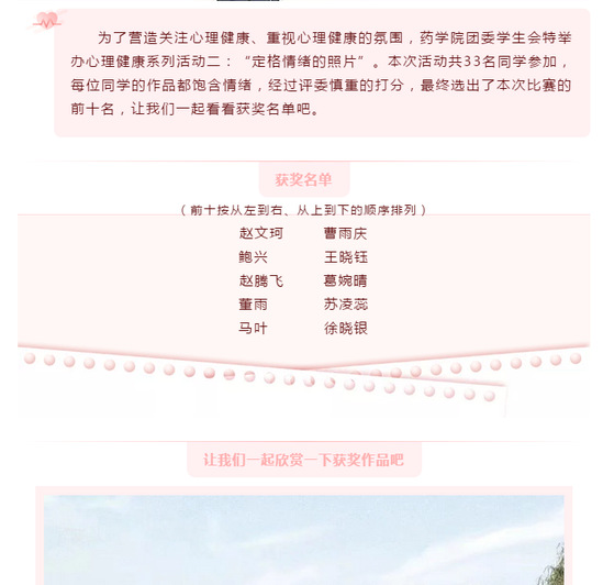 定格情绪的照片。5月20日至6月初,药学院团委学生会举办心理健康系列活动之“定格情绪的照片”。同学们通过一张张或青春洋溢、或童真童趣、或幸福居家、或美好友情的照片,来缓解心理压力,抒发心中情感,迎接美好生活。