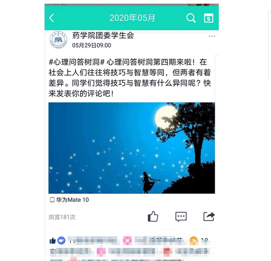 心理问答树洞。5月25日至6月中旬,药学院团委学生会举办心理健康系列活动之“心理问答树洞”。活动中,同学们在线参加心理问题的讨论并发表评论,学习相关心理健康知识,锻炼自己的心理品质。活动的开展,让同学们重视心理健康的意识得到进一步加强,心理素质得到进一步提高,展现出药学院学子积极向上的精神风貌。