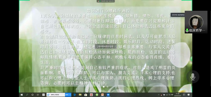 心理主题班会。用“心”抗疫,我们在努力。6月下旬,药学院2019级开展了线上心理健康教育主题班会。班会主要围绕疫情造成的影响、疫情期间出现的心理问题、心理调控和疏导,以及树立正确的人生态度等四个方面展开。通过生动的案例分析和形象幽默的图片展示,让同学们了解心理自我调节的方法,讨论各自在疫情期间的心理变化,并分享自己的调节方式。班会现场讨论氛围浓厚,同学们都打开心扉,畅所欲言。通过这次活动,帮助同学们在疫情期间加强心理调试,增强心理免疫力,有效地维护了心理健康。