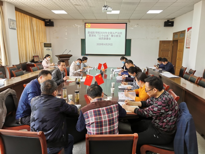 为进一步贯彻落实党中央、省委关于党的作风建设工作要求,推动学院全面从严治党向纵深发展,4月29日下午,基础医学院党委组织召开2020年全面从严治党暨深化“三个以案”警示教育动员部署会,传达落实中央、省委和学校党委关于全面从严治党会议精神。学院班子成员、各支部书记、教研室(实验实训中心)负责人参加会议,会议由学院党委书记余结根主持。