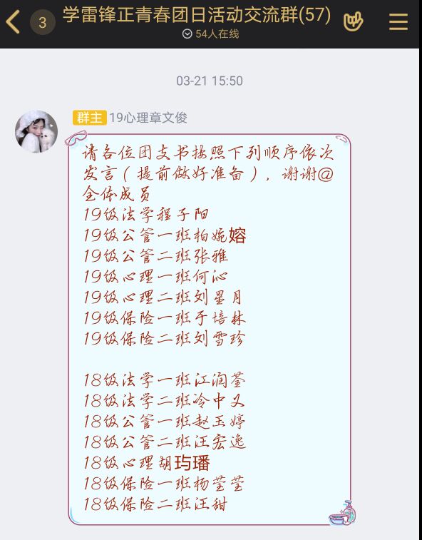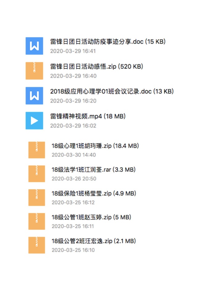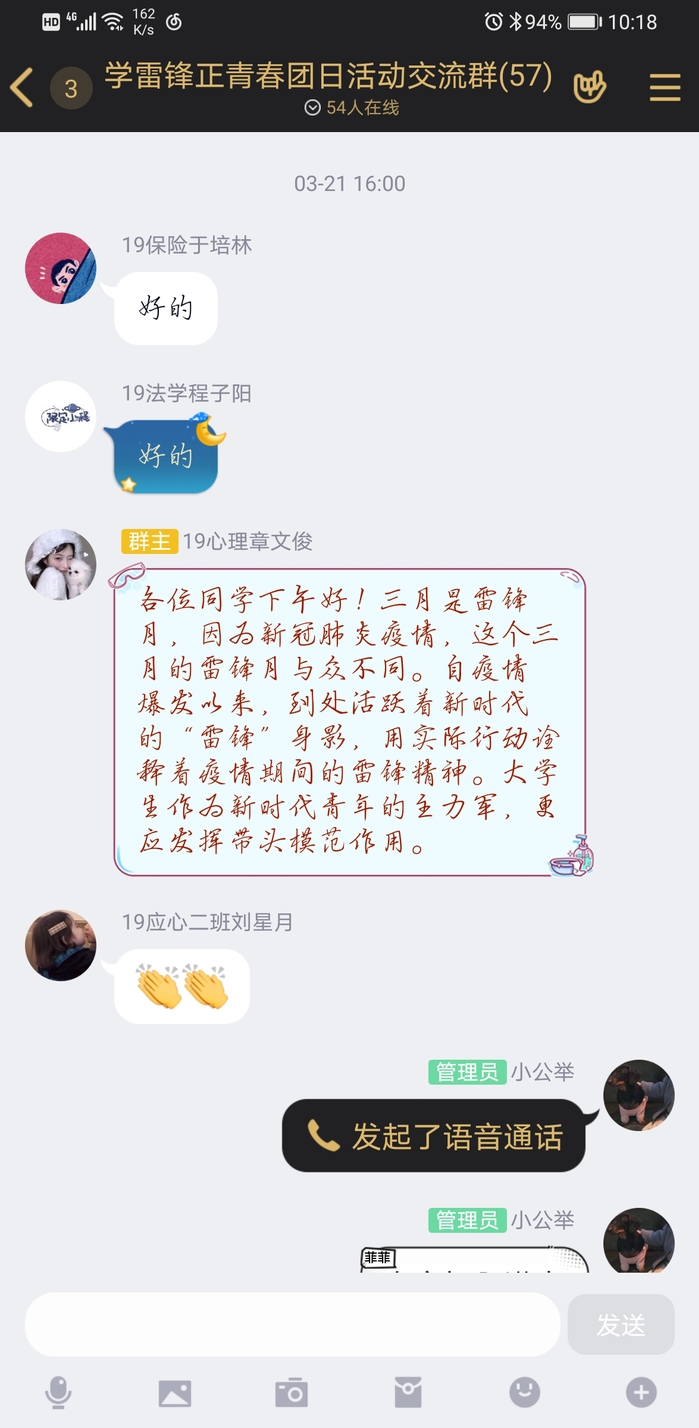 为弘扬雷锋精神,践行志愿服务,将雷锋精神融入到当代大学生的青春实践中去,同时激发学生干部的示范引领作用,2020年3月份,人文与管理学院组织开展了为期一月的“学雷锋”主题活动,并于3月21日下午四点,学院团委召开了“传承雷锋精神,凝聚青年力量”主题团日活动,2018级、2019级各班团干通过网络平台积极参与其中。