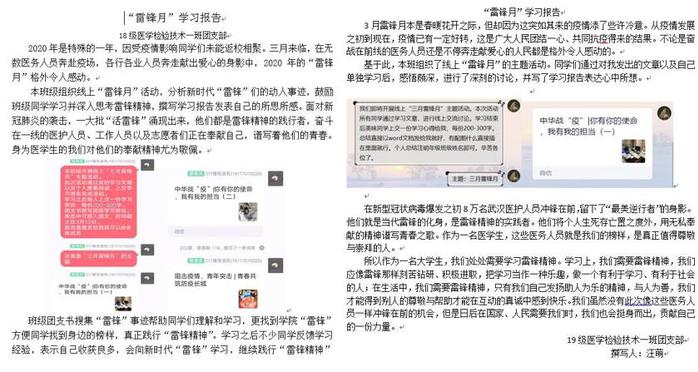 在检验学院团委的号召下,检验学院各团支部通过手机、电脑、电视等平台在线上进行了“雷锋精神”学习,包含习近平给北京大学援鄂医疗队全体“90后”党员的回信,学校校园网和学院微信公众号所推出的优秀毕业生和优秀工作者事迹,以及其他优秀工作者事迹等。