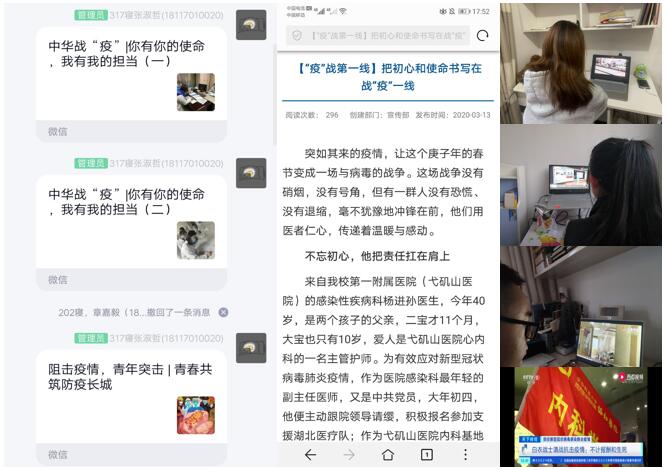新型冠状病毒疫情暴发以来,无数党员和先进工作者主动请缨前往防疫第一线,用生命坚守岗位,尽己所能救死扶伤,他们是最美的“逆行者”。这里面不乏有我校第一附属医院和第二附属医院的优秀医护人员,同样也有我校甚至我院毕业的优秀毕业生。同学们均被“逆行者”的大爱情怀、忘我精神所感动,纷纷表示在今后的学习与工作中,不忘初心、牢记使命、勤奋学习,做一名合格的医学生。学院团委书记曹玉祥强调,“雷锋精神”不仅仅有抗疫英雄轰轰烈烈的大美逆行,还包括每个平凡人肩负的责任和担当。青年团员向抗疫英雄致敬,在疫情期间要严格要求自己,主动应对学习方式转变带来的不适,主动融入空中课堂,主动完成课上作业,主动打卡汇报行程变化,做到学习、防疫两不误,用实际行动守望春暖花开。