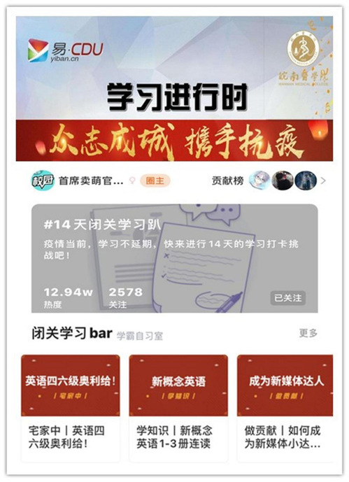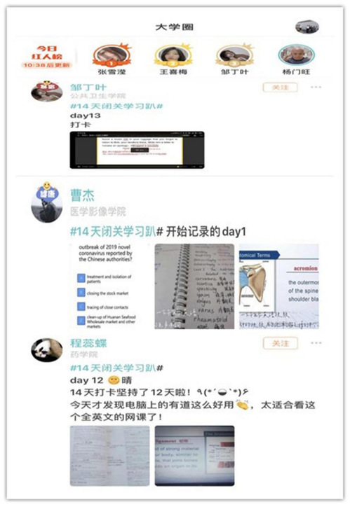 “2020年伊始,这场突如其来的疫情打乱了我们之前对寒假的全部计划,同时多了两个月在家的‘闭关生活’。充分利用寒假来加强学习、提升自我,在平台上督促自我、打卡学习,为下一阶段的实习以及今年12月份的考研打下扎实基础,是当下最重要的事情。”我校的“易班·今日校园APP”校园红人榜之星、公共卫生学院邹丁叶同学和医学影像学院曹杰同学以及药学院程蕊蝶同学等学子们说到做到,积极参与“14天闭关学习趴”话题活动,连续多日以打卡形式展示了他们的自主学习成果。同学们纷纷表示:“打卡学习是对自我的督促和鞭策,使自身学习自律性明显提高,学习效果也获得了显著提升。”