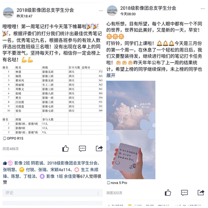 今日事今日毕。本次活动设置打卡模式,以学校的教学周为单位,参加者每天可向年级团总支分会的QQ公共号提交当日相关课程的学习笔记,每周末评选出本周最美笔记。课程内容涵盖新学期线上教学的专业课以及英语等课程,年级也会每天通过线上展示给大家鼓劲加油。打卡次数作为评比分值的重要组成部分,努力让温故知新成为一种习惯。