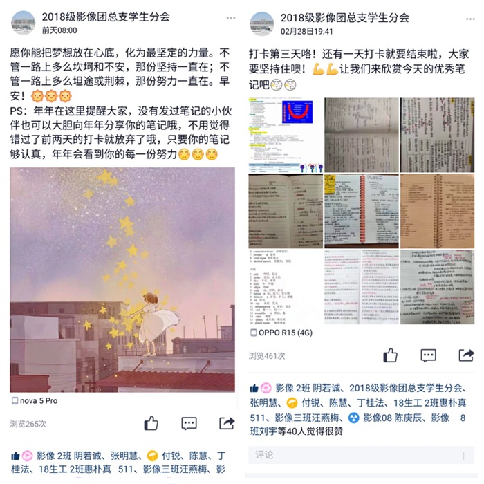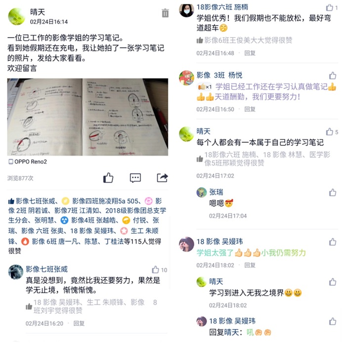 线上学习是一次对学生自我安排能力、自控能力的考验,为了鼓励和动员广大学生积极参与本次活动,辅导员联系已毕业的影像专业学长学姐,晒出他们工作之余的“充电”笔记,在学生中引起了很大的触动。