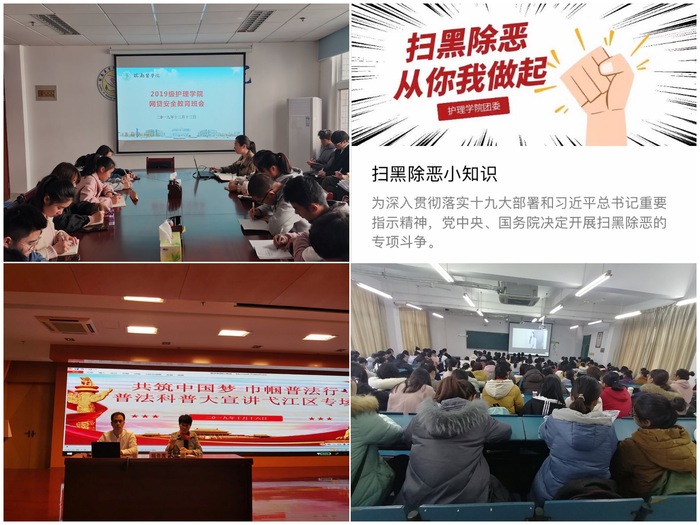 为维护校园和谐稳定,保护师生合法权益,11月中旬至12月上旬,学院开展了扫黑除恶系列宣传活动。线下,组织开展了“共筑中国梦 巾帼普法行”专题讲座、网贷安全教育班会、集体观看《传销笔记》《柳暗》等打击传销微电影;线上,推送了扫黑除恶相关知识,加深了同学们对扫黑除恶内容的理解。