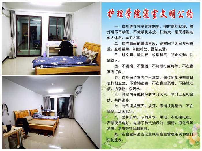 为营造良好学生宿舍文化氛围,促进学生精神文明建设,11月24日,学院举行了安全文明寝室评选工作。本次评选对全院400余间寝室进行了综合评分,最终遴选出25个“安全卫生文明寝室”。同时为了加强寝室安全和卫生管理,学院还制定了护理学院寝室文明公约。