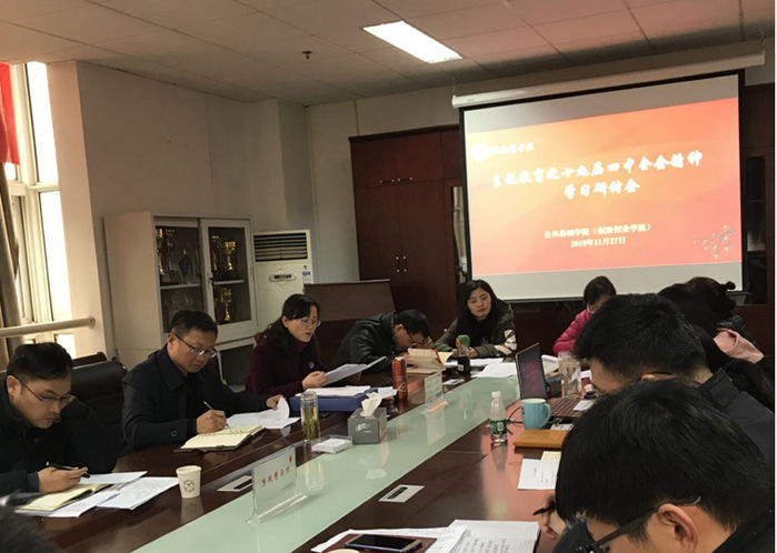 11月27日中午,公共基础学院党总支召开十九届四中全会精神学习研讨会。学院党政班子成员、各党支部书记、教研室主任、秘书参加学习研讨。会上,党总支副书记何爱民领学了《中共中央关于坚持和完善中国特色社会主义制度、推进国家治理体系和治理能力现代化若干重大问题的决定》、四中全会公报以及习近平总书记在全会上的重要讲话精神。院长杜少陵在个人自学和集体学习的基础上,谈了七点学习体会,认为全会《决定》通篇贯穿着坚定自信、坚守根本、改革创新的精神,是新时代坚持和完善中国特色社会主义制度、推进国家治理体系和治理能力现代化的政治宣言和行动纲领,要学习好、宣传好、贯彻好十九届四中全会精神,切实把思想和行动统一到全会精神上,落实全会确定的各项任务;要结合实际学,推进学院制度建设,推进学院依法依规工作,提高工作效能。何爱民从对党绝对忠诚、坚定中国特色社会主义制度自信、自觉践行“两个维护”和建立践行初心使命长效机制交流了学习心得。