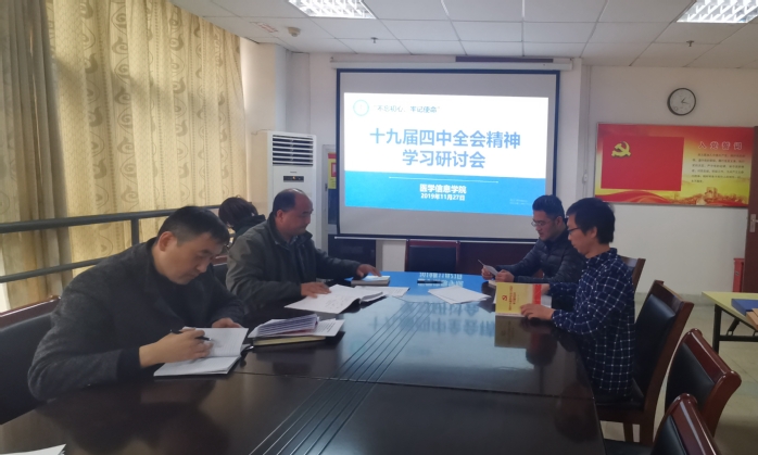 11月27日中午,医学信息学院党总支在学院会议室召开党的十九届四中全会精神专题学习研讨会,会议由学院党总支书记陈晓宏主持,副院长叶明全、教工党支部书记张浩和学生党支部书记韩琪参加。