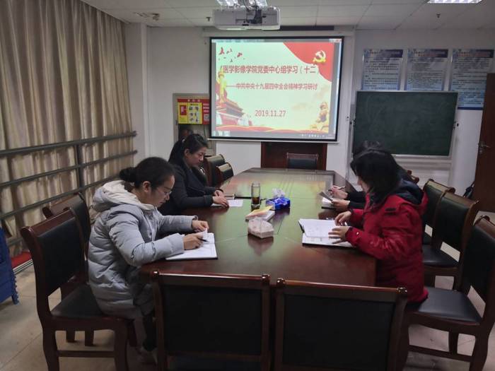 11月27日,医学影像学院党委开展学习党的十九届四中全会精神研讨交流会,学院党委书记、副院张建英主持会议,学院党委委员参加会议。