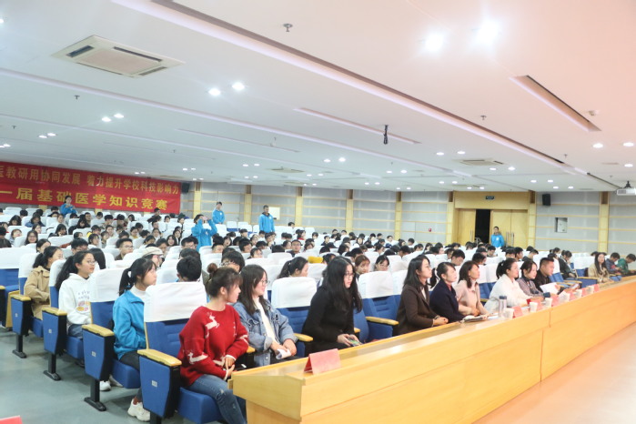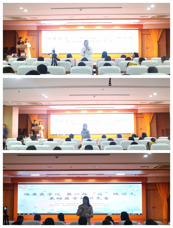 为定期检验学生的学习效果,营造良好的学习氛围,形成良好的学风,2019年11月21日晚,临床医学院在图书馆三楼报告厅成功举办第一届“医”路领先基础医学知识竞赛。本次竞赛由药理学教研室张俊秀、诊断学教研室黄亚纬以及临床医学院高红亮担任评委,特邀临床医学院党委副书记陶香香,2017级辅导员李海莉、赵敏奇出席,学院300名学生到场观看。
