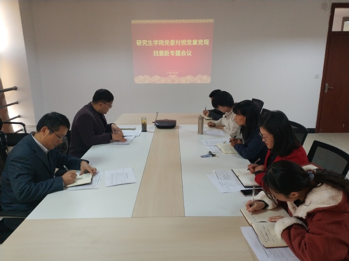11月18日下午,研究生学院党委于学院会议室召开对照党章党规找差距专题会议,会议由学院党委副书记、副院长戴照福主持,学院党委委员、各支部书记及辅导员参加了本次会议。