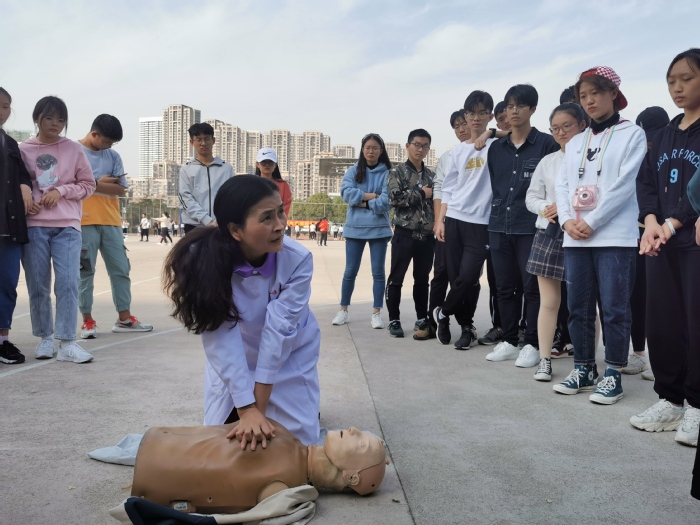 担使命——医者仁心默无言,桃李勤学志高远。为强化户外活动急救意识,规范急救流程,增强作为医学生的使命感,药学院邀请弋矶山医院急危重症护士长袁莉萍,在篮球场为同学们讲解户外急救技术和心肺复苏基本理论知识。袁莉萍老师亲自演示户外急救措施,同学们热情高涨,现场气氛十分热烈。此次活动中,同学们不仅学习到了户外急救流程,同时提高抢救病人的理论知识和技能水平,为今后的学习生涯蓄一份力。