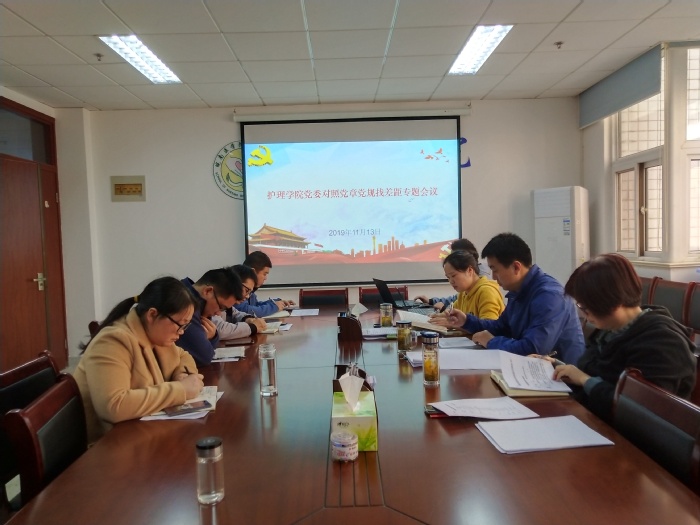 2019年11月13日下午,护理学院党委召开对照党章党规找差距专题会议,学院班子成员、党委委员、各党支部书记参会,会议由学院党委书记陈抗震主持。
