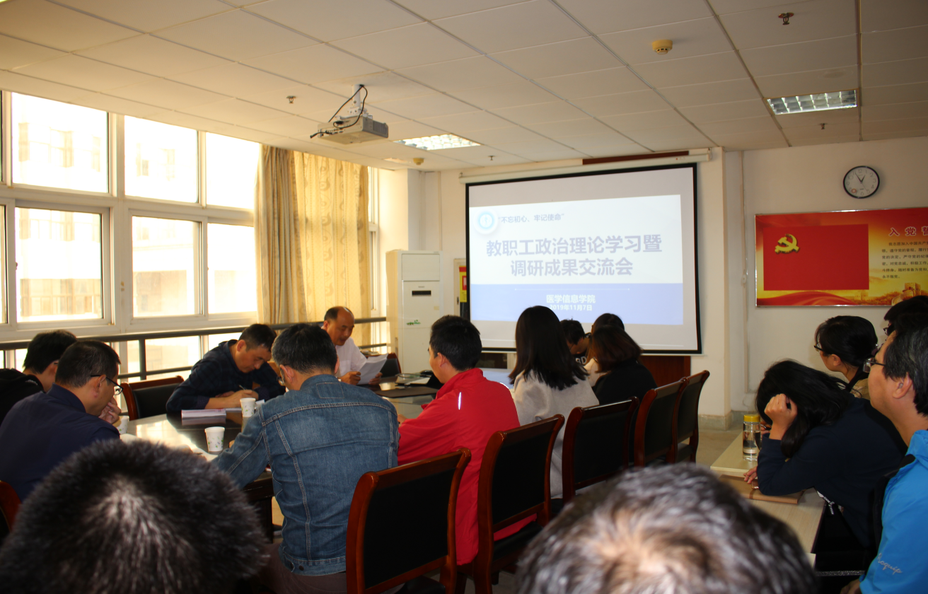 11月7日中午,医学信息学院党总支在学院会议室召开教职工政治理论学习暨调研成果交流会。全体教职工、在校学生党员参加会议,会议由学院党总支书记陈晓宏主持。