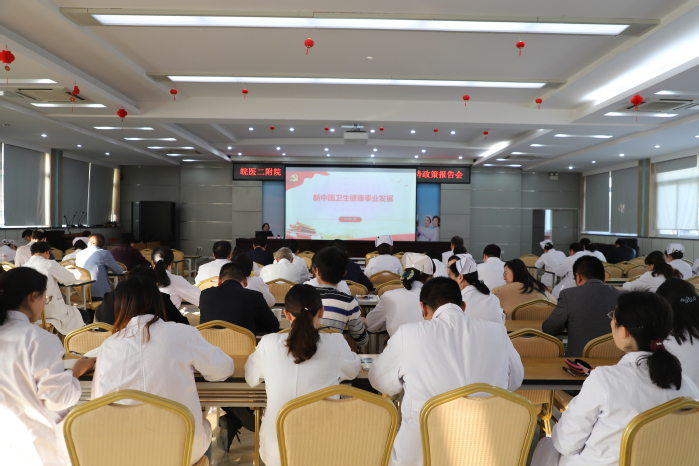 李萍以《新中国卫生健康事业发展》为题,围绕卫生健康事业发展的形势政策报告了三个方面的内容。她一是从医疗服务的可及性明显改善、群众健康指标持续向好、医疗保障全民覆盖、公共卫生防控能力提升、医疗医药水平突破五个方面介绍了我国卫生健康事业发展取得的重大成就,解读了新中国成立以来卫生工作的方针政策,回顾了医疗卫生体制改革的探索历程,总结了70年卫生健康事业在党的坚强领导下开创的一条中国特色之路;二是对习近平健康中国建设系列论述思想精髓进行深入讲解;三是阐述全力推进健康中国战略需要完成的各项重点任务。报告最后,李萍对新形势下二附院如何建设发展提出了思考,强调二附院人要把握机遇,迎接挑战,牢记使命,努力拼搏。她号召全院广大职工要不忘医者初心,牢记服务人民健康使命,立足70年院庆新起点,提高医疗技术水平,改善医疗服务质量,提升医院现代化管理水平,为医疗卫生事业,为医学教育事业发展再立新功!