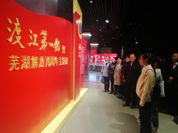 在芜湖市博物馆——渡江第一船展馆开展革命传统教育。馆内分渡江战役、渡江第一船、芜湖解放三个部分。芜湖是人民解放军渡江的重要突破口,也是渡江第一船的出发地和登陆地。展览厅集中展示了渡江战役发生的全过程,展现了芜湖在渡江战役中的重要地位,“军民团结、同舟共济、众志成城、奋勇向前”的渡江精神深深打动了在场的每一位同志。全体同志随后参观了馆内其他展厅,了解芜湖的历史和文化。