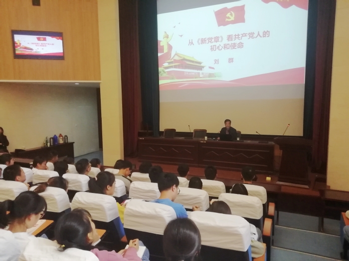 31日中午,刘群以《从< 新党章>看共产党人的初心和使命》为主题进行第二阶段的党课培训,带领大家一起回顾党章的发展历程,明确党章的精神内涵,主要讲述了党章概述、党的发展历程、十九大党章修改的主要内容、党章的总章以及党章的条文。接着他结合“不忘初心、牢记使命”主题教育,引用革命先烈们的事迹,诠释了共产党人的初心和使命,教育和引导入党积极分子。他强调,作为新时代的大学生,初心和使命就是热爱祖国,牢记历史,牢记时代赋予的使命,让中华民族伟大复兴的中国梦,在一代一代青年的接力奋斗中变成美好的现实。现阶段要完成历史赋予的伟大使命,首先就是要树立远大的理想,坚定四个自信,自觉践行社会主义核心价值观;努力学好知识,将个人的理想和价值体现与国家的前途命运紧紧地联系在一起。他希望广大学员认真研学新修订的党章,做到学原文,悟原理,准确把握党章中的精神实质,全面掌握核心要义,切实贯彻学而信、学而用、学而行。