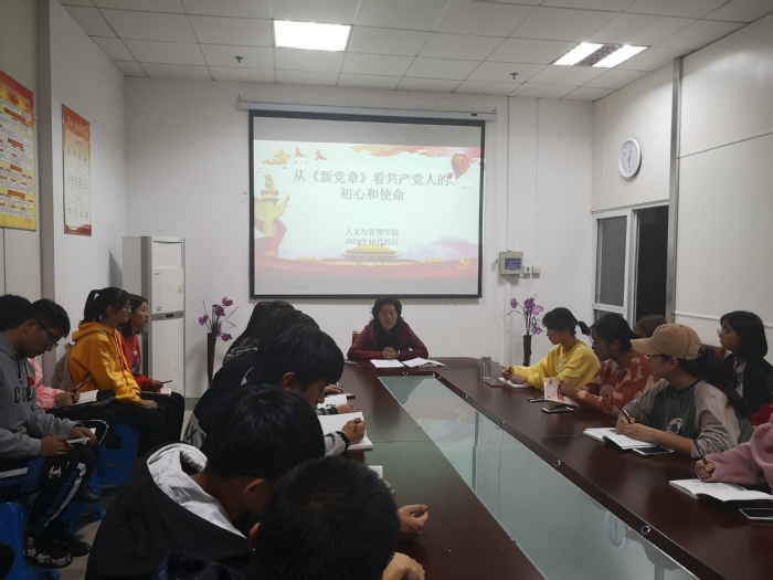 人文与管理学院党委书记窦弘以“从《新党章》看共产党人的初心和使命”为专题,以“新党章学习”为教学核心,通过事实举例,为入党积极分子授课。她强调,各位同学要牢记自己积极加入党员队伍的初心,端正入党动机,始终保持高度自觉,在学习和生活中保持批评与自我批评的态度,勇于承担起党员的责任与使命。