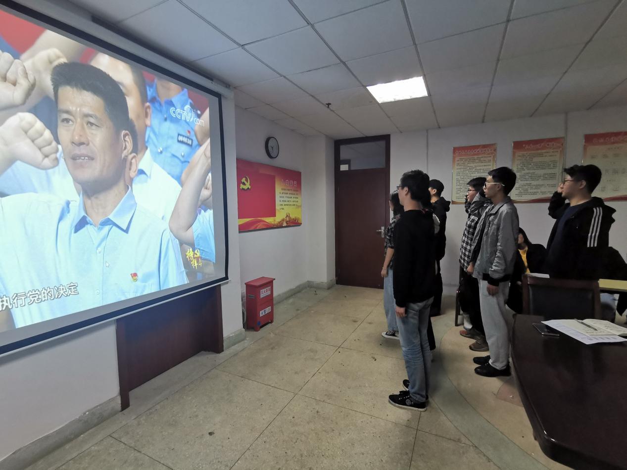 在《榜样4》节目尾声,学生党支部书记韩琪带领所有学生党员跟随节目,面朝党旗庄严宣誓。铿锵有力的声音,彰显着大家学习榜样精神,学习历史进程中党员努力奋进的责任担当,学习为实现中国梦而奋力拼搏的决心。