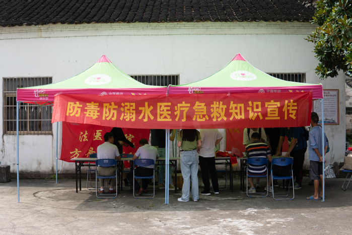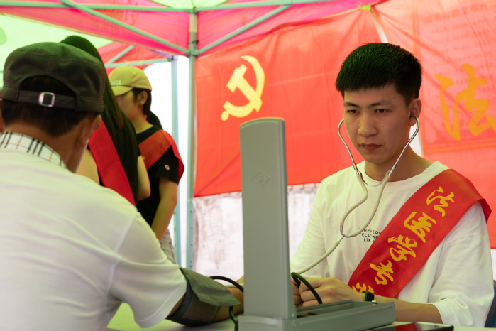 实践队在铁军广场设服务站,一部分队员在服务站向居民和游客开展安全急救知识宣讲,提供血压测量等医疗服务。另一部分队员走向一线,深入当地居民家中开展安全急救知识访谈、发放宣传资料,并完成安全急救知识问卷。活动过程中,队员向当地居民和游客发放了夏季防暑用品带,方便当地群众的工作与生活。