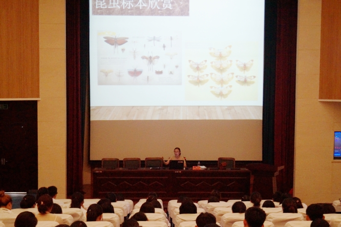 精采细烘存草木,用心雕琢成艺术。当日上午9:20讲座正式开始。本次讲座特邀药学院生药教研室李丽华教授进行主讲。讲座中,李老师结合图片和自己的经验向大家讲解了动植物样本采集的注意事项、时令把握,重点强调了野外采集工作的安全性。随后李老师向同学介绍了常见的三种植物标本类型,以及标本制作的流程和工艺,并分享了往年学生制作出的精美参赛作品图片。场下同学仔细聆听,表现出来对动植物标本制作的强烈兴趣。