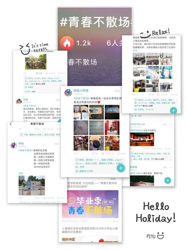 光阴悄然在指尖流逝,大学时光聚成一抹抹浓墨重彩的绚丽光影,倒映着我们的踌躇满志、我们的热血青春。青春不散场,离别为追梦,为了欢送全体2019届毕业生,不忘初心,牢记使命,寄情母校,放飞梦,学校易班发展中心于5月—6月陆续开展了“青春不散场”主题系列活动。