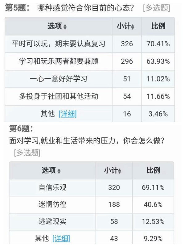 5月17日到18日,年级学生会心理健康部进行大学生心理健康状况的问卷调查,共有463名学生填写问卷。问卷分析显示,87.47%的同学认为医学生学习压力较大,但其中69.11%的学生仍持自信乐观的态度,且多认为学习和娱乐需要兼顾。同时大部分学生普遍懂得情绪的自我调节,可以保持好学习、生活和娱乐之间的平衡。