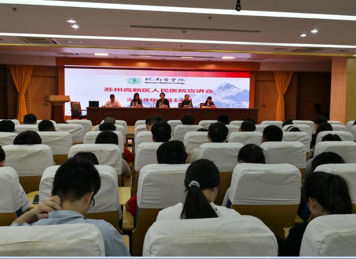 张建英向刘圣亚、王艳玲一行的到来表示欢迎和感谢,简要介绍了学院发展和学生实习就业情况。刘圣亚从苏州高新区人民医院的发展概况、人才培养、就业能力培养、实习与就业的关系等方面与同学们作了详尽分享;王艳玲向同学们介绍了医院影像科的发展、设备、教学科研以及对外交流等,重点介绍了影像科室的人才培养和实习带教情况。