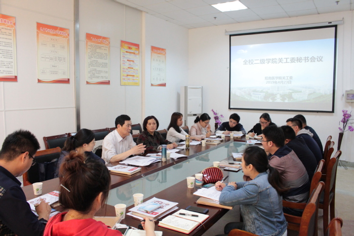 4月23日下午,校关工委在人文与管理学院会议室召开全校二级学院关工委秘书会议。校关工委常务副主任周强、秘书长朱丹以及各二级学院关工委秘书参加会议。会议由周强主持。
