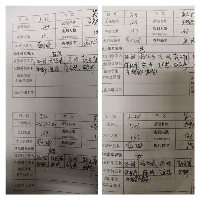 全力推进“以一带三”活动,严格执行《护理学院晚自习制度》《护理学院宿舍查寝制度》及《护理学院课堂考勤管理制度》,年级辅导员深入班级、宿舍、操场,严抓课堂纪律出勤率,保障早操质量。同时发挥学生自我管理的作用,每班成立“学风督查小组”,每节课填写《护理学院学生课堂出勤记录薄》。