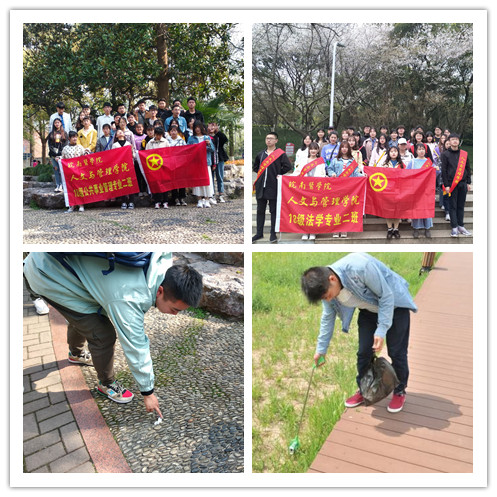 除了校园内,校外也不乏学生志愿者的身影。2018级学生通过申请,在保证同学们安全的情况下赴赭山公园开展环境保卫活动。学生小分队从不同的道路往赭山山顶前行,一路上拾拣垃圾、扶正指示牌,以及积极帮助有需要的游客。志愿活动主要让学生体会到劳动者的不易,尊重他们的劳动成果,自觉保护环境,贯彻落实习近平总书记“绿水青山就是金山银山”的重要讲话精神,也让同学们在活动中体会到互帮互助的重要性,增强班团一体化建设,提高集体凝聚力。