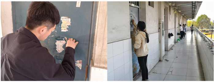 2018级卫生检验与检疫1班团支部分别在滨江校区3号和5号宿舍楼开展了“清除校园牛皮癣,洁净宿舍小环境”活动。清除“牛皮癣”不是件容易的事情,但这并没有难到同学们,大家有拿铲子的,有拿小刀的,还有拿着刷子的,都在为美好宿舍环境努力着。通过清除严重影响着校园寝室形象的各种“牛皮癣”小广告, 为清洁美丽校园大环境贡献自己的绵薄之力。
