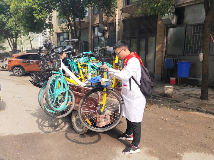 清洁脏垢散春光,归整单车暖心肠。志愿者们在儒林西苑开展了公益清洁和归整共享单车活动。志愿者们分工合作、互帮互助,对社区周围道路进行全面清扫与整理。朝气蓬勃的药学院学子,发扬不怕脏不怕累的精神,将周边街道打扫得干净整洁,将共享单车整理的整整齐齐。志愿者们用实际行动为创建美好社区环境奉献了一份力量。