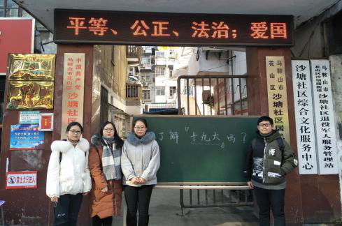 2018级法医学同学们利用假期走进马鞍山市沙塘社区,积极开展了以“我眼中的十九大”为主题的宣讲活动,面向广大社区群众,从青年角度宣传十九大精神,在学习宣传十九大精神的热潮中迸发青春的活力。