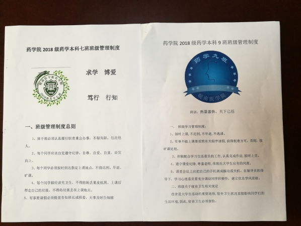 为加强2018级新生班级建设和班级管理,调动班干部工作的积极性,增强班级凝聚力,展现班级特色,创建团结友爱、奋发向上、纪律严明的优良班集体,并为树立良好的班风和学风打下基础,2018年10月12日至28日,药学院在滨江校区举办了2018级新生班级管理制度规划大赛,药学本科、临床药学、药物制剂、药学专升本等专业23个班级参加了此次大赛。大赛由2018级辅导员张叶明、徐启祥和助理辅导员策划执行,团总支学生会主席团成员和辅导员老师负责打分和评选。此次大赛主要涉及班徽、班训设计以及班级管理制度的制定三个方面。